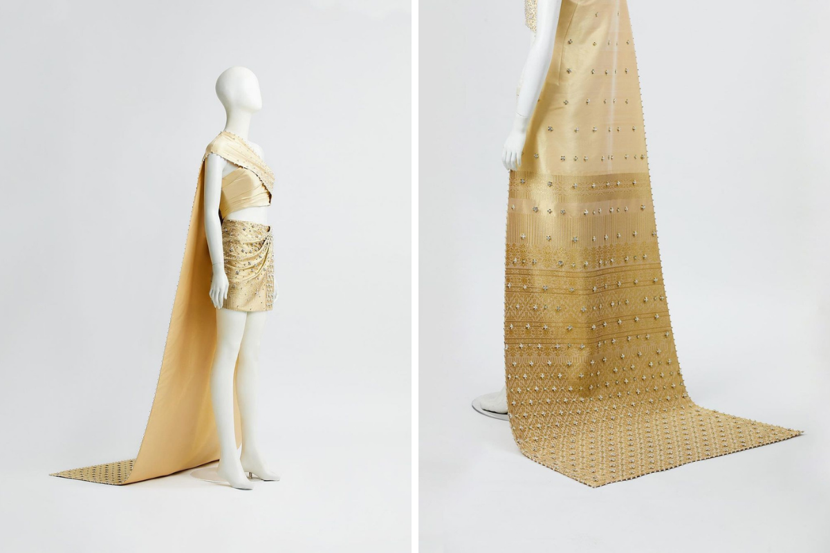 The gold, Swarovski-laced outfit, which comprises a sabai or breast shawl and a zin or sarong wrap, is really a bespoke, hand-embroidered piece by Thai designer Asava. A gold mongkut headpiece completes the royal ensemble.