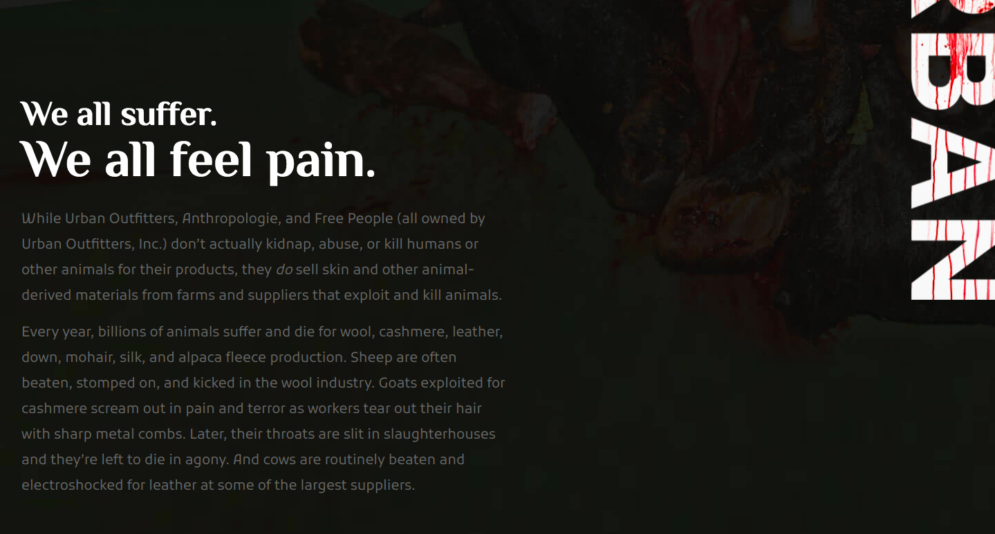 “Urban Outfitters may not sell our skin, however it sells skin from sentient beings. Its stores already sell luxurious, animal-free textiles, so it should be easy for these to sell only those and remove all animal-derived products.”