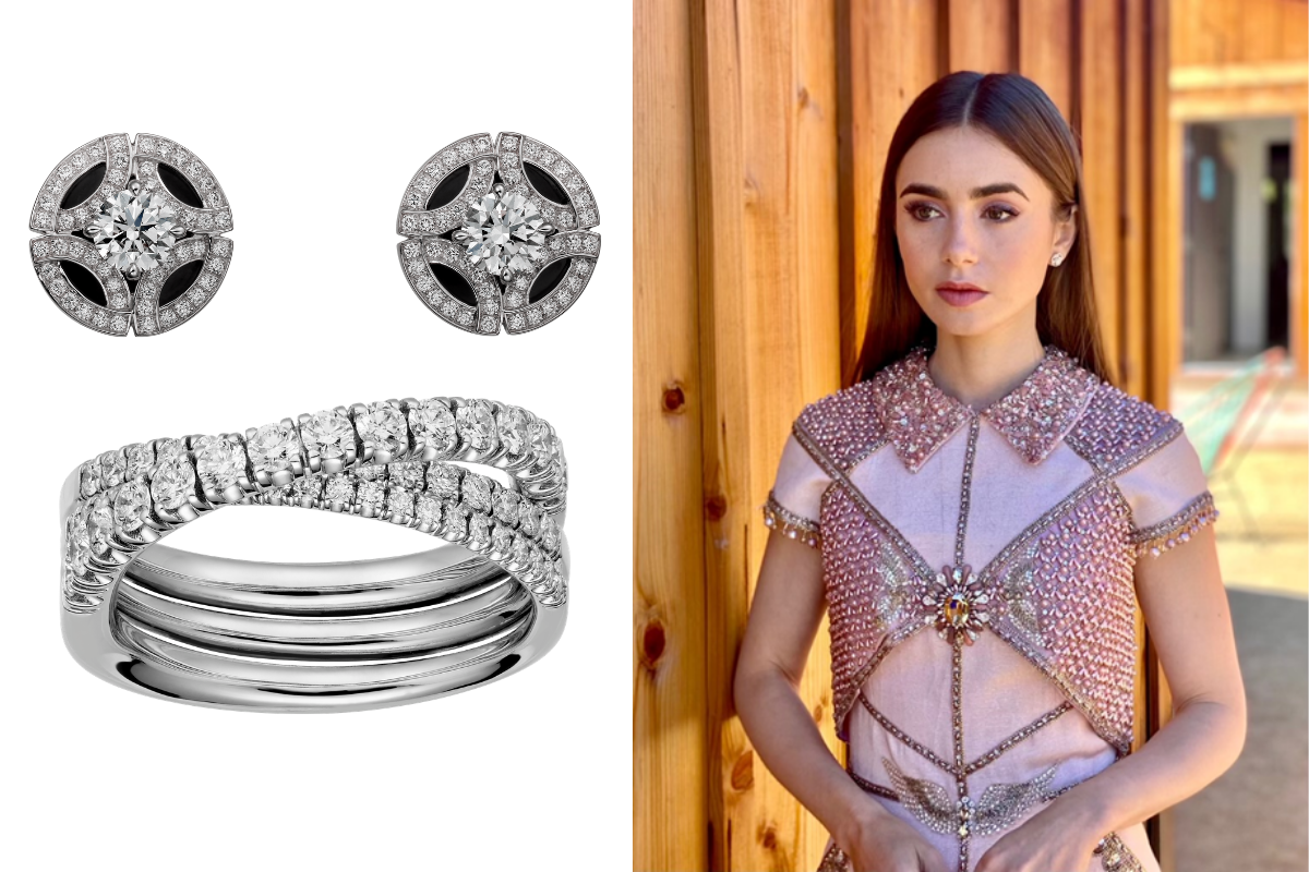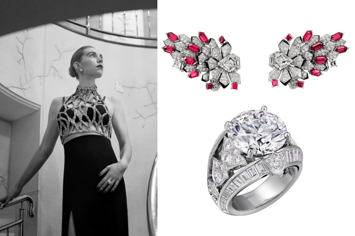 Cartier High Jewelry earrings, 18k white gold, rubies, black lacquer, diamonds Cartier High Jewelry ring, platinum, diamonds