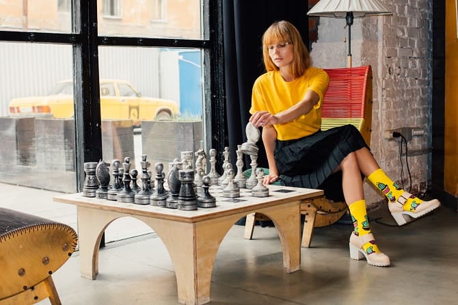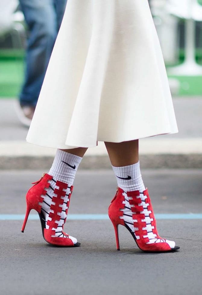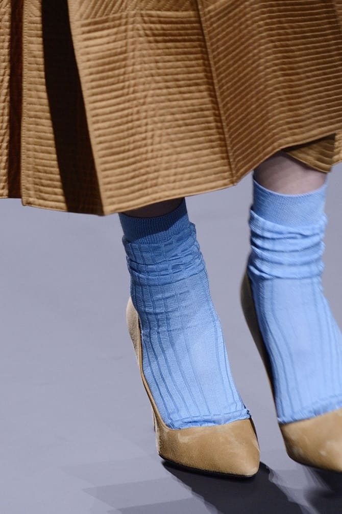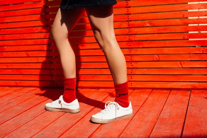 In before summer 2022, plain socks, with a bright print or with glitter, will be in fashion. They may be worn with flip flops, platform shoes, lofters, pumps, sports shoes.
