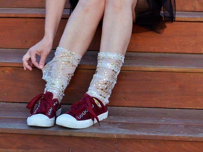 You could make the look boring with the help of shiny, for example, silver or golden socks. They fit perfectly underneath the dress.
