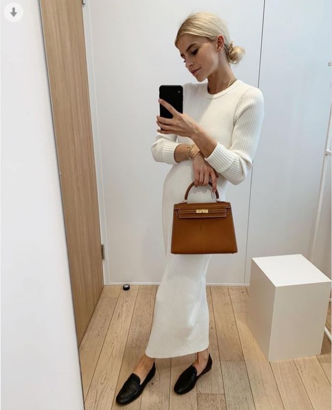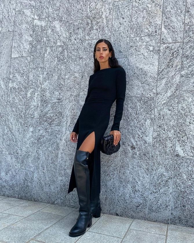 Over it, you can put on a hot oversized quilted coat, which is very fashionable this year. Black color provides you with flexibility when it comes to possible combinations with a sweater dress. The combination with a stylish crocodile leather bag looks very stylish.