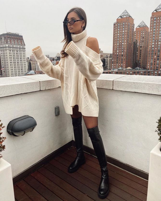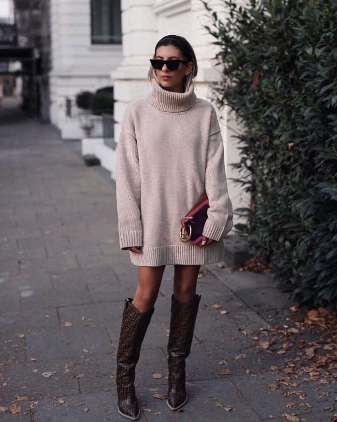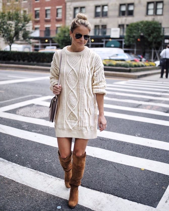 When temperatures drop in winter, a comfortable sweater dress could keep us warm. It guarantees good defense against the cold, is comfortable to put on, and the feminine cut can help you look very sexy. If you prefer a little change in your usual style, pair the dress with knee-high boots with a wide shaft. Make sure you wear warm tights within knitted dress.
