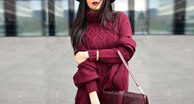 This is really a classic combination that meets everyone. You can use black accessories or complement the Marsala sweater with a dark skirt, trousers. Additionally, black may also become the main color, thanks to which the set looks more restrained.