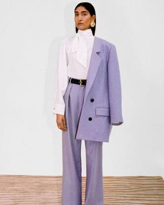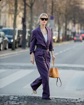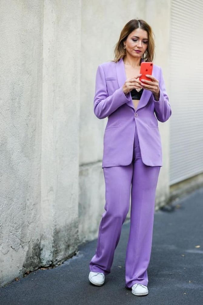 If you need to make your look more harmonious, complement clothes in Very Peri color with accessories or wardrobe items in gentle, romantic shades. For example, it may be pastel, yellow, pink, light blue or green shades. Combinations with classic monochrome look no less harmonious.