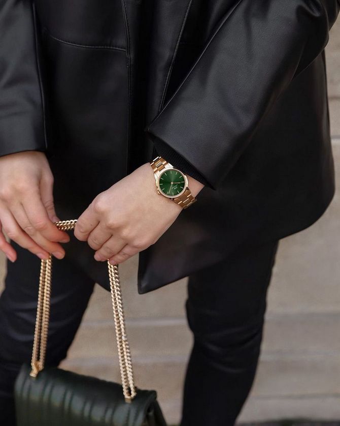 In dark clothes, warm colors are well expressed. For black clothes, along with jewelry, watches are also needed, particularly if they are also in gold or bronze shades.