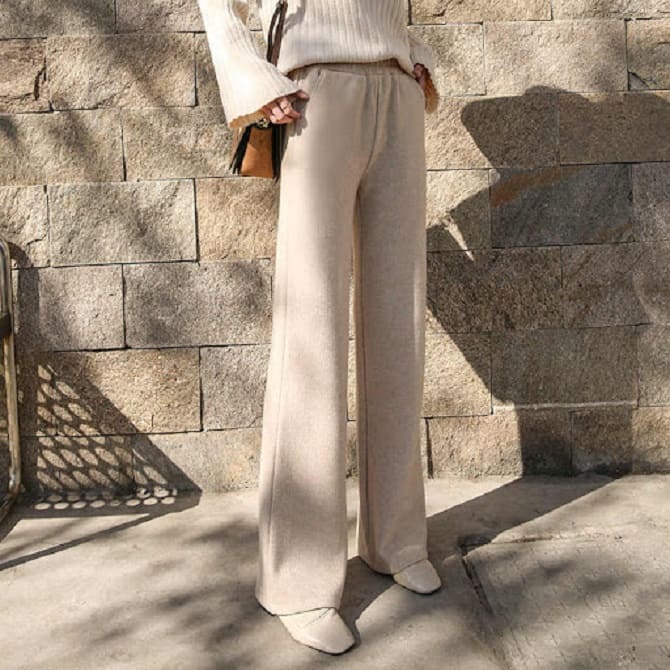 Try pretty jersey pants rather than jeans. They appear fashionable and relevant within the year. And it is not at all essential to wear sports models, because there are many options in the classic style. Choose solids in warm shades or plaid.