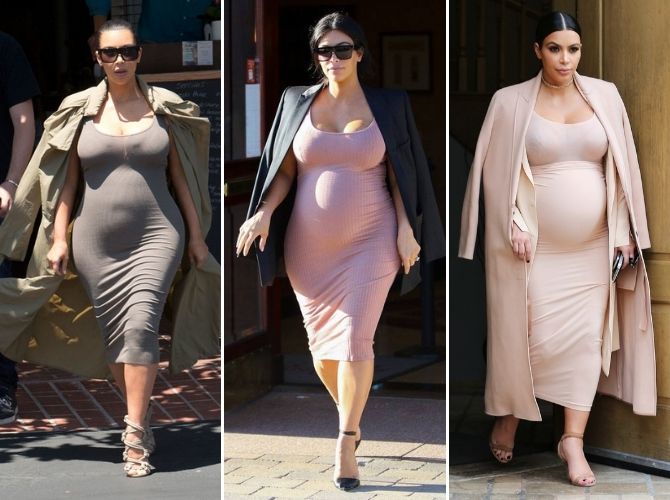 Kim Kardashian beamed during each of her pregnancies and would rather dress in long stretch dresses. This outfit offers a lot of abdominal space and appears elegant. For colder days, choose knitted dresses. Pull on a cardigan and continue enjoying your pregnancy.