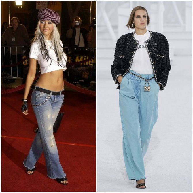 As low so that as wide as possible. This version of trendy jeans was popular within the 2000s. Today, we see exactly the same models of trousers matching a crop top, obviously.