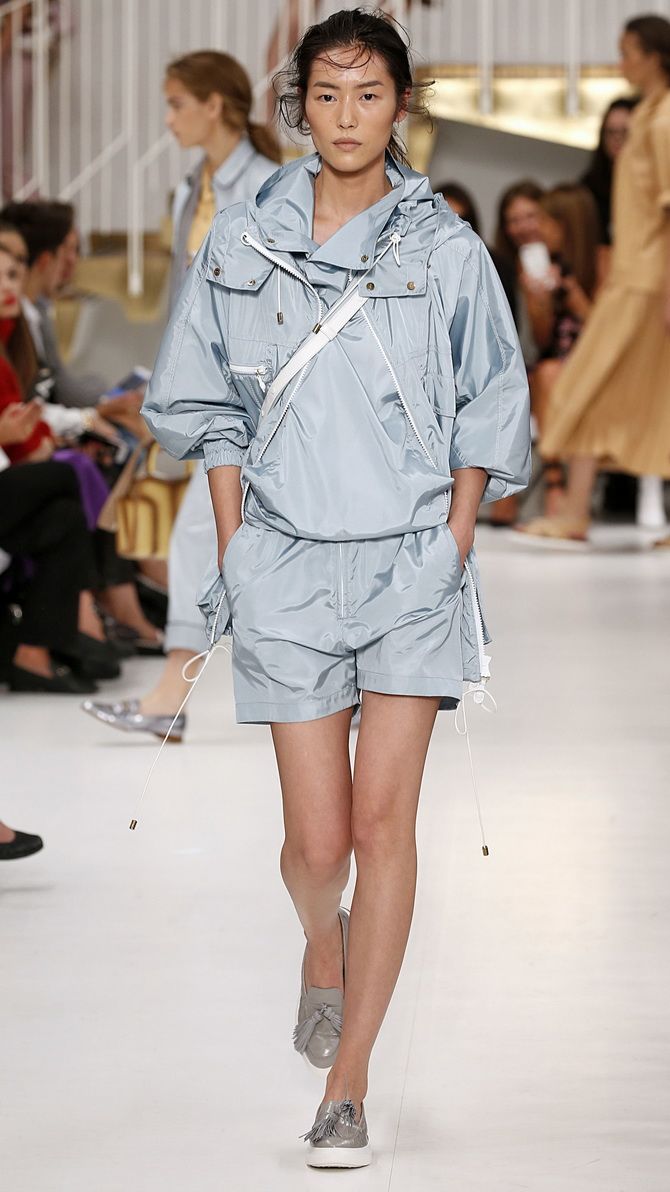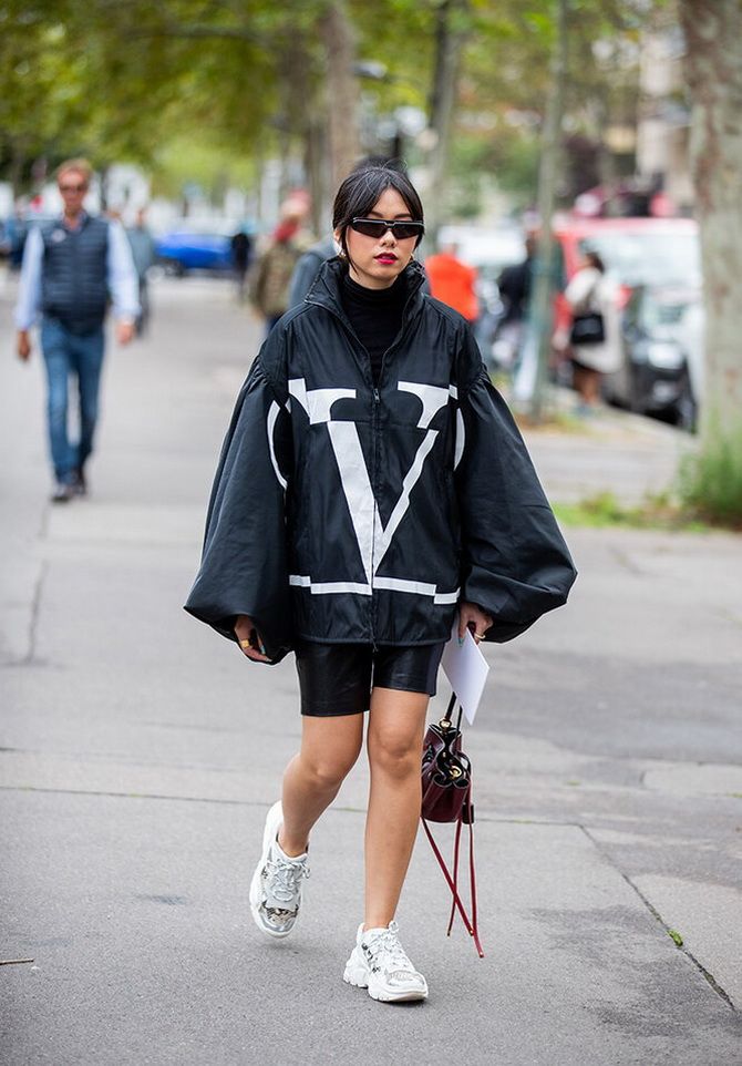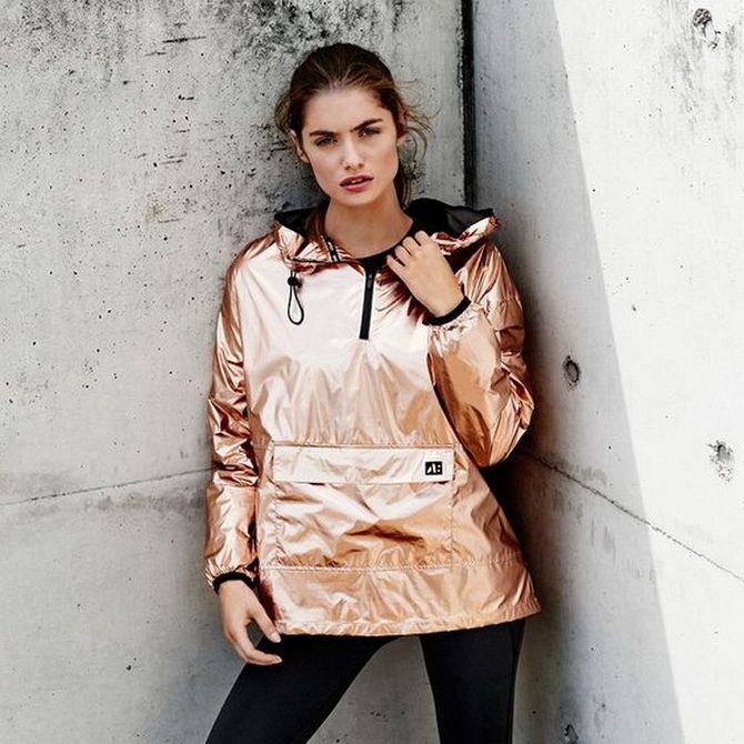 Elongated windcheaters come in the form of a parka, which is suitable for city walks. This model is much more ideal for tall girls. Stylists recommend combining it with sports leggings, white sneakers, thin turtlenecks. Check out the stylish look from Lady Gaga – long Versace windbreaker and black high-heeled sandals.