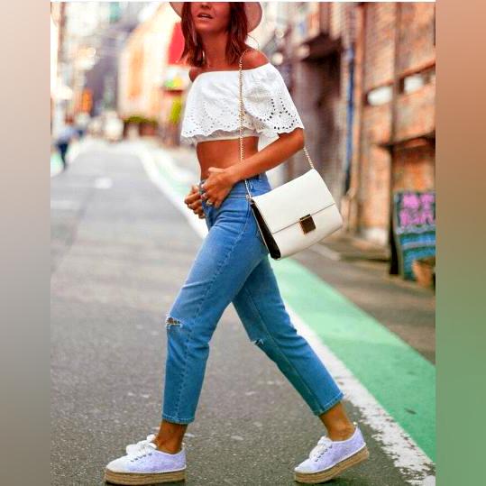 I think you can do much better combinations with espadrilles than what this girl has done here. Her outfit looks very casual, but she also wore a short-sleeved collarless blouse and ripped jeans that make her look more feminine than she is really. I simply don't like the option of the shoes and I think this outfit would work better with flats or sneakers.