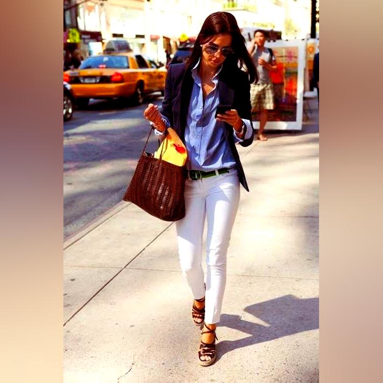 Another woman wears espadrilles while she goes shopping however this time she uses different types of clothes. She wears a white skirt, which looks very cute on her thighs and ass, and black espadrilles which make her look sexy simultaneously. She tops her outfit with a short-sleeved blouse made from stretchy fabric. The shirt hugs her body and makes her seem like an angel. I really like this outfit! It is really cute, elegant and sexy at the same time. This woman needs to wear this skirt more regularly!
