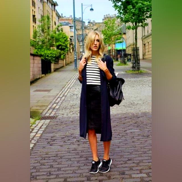 This is really a dark twist around the classic black blazer/skinny jeans combo. An important feature about this outfit is that trainers could be worn with any color blazer!